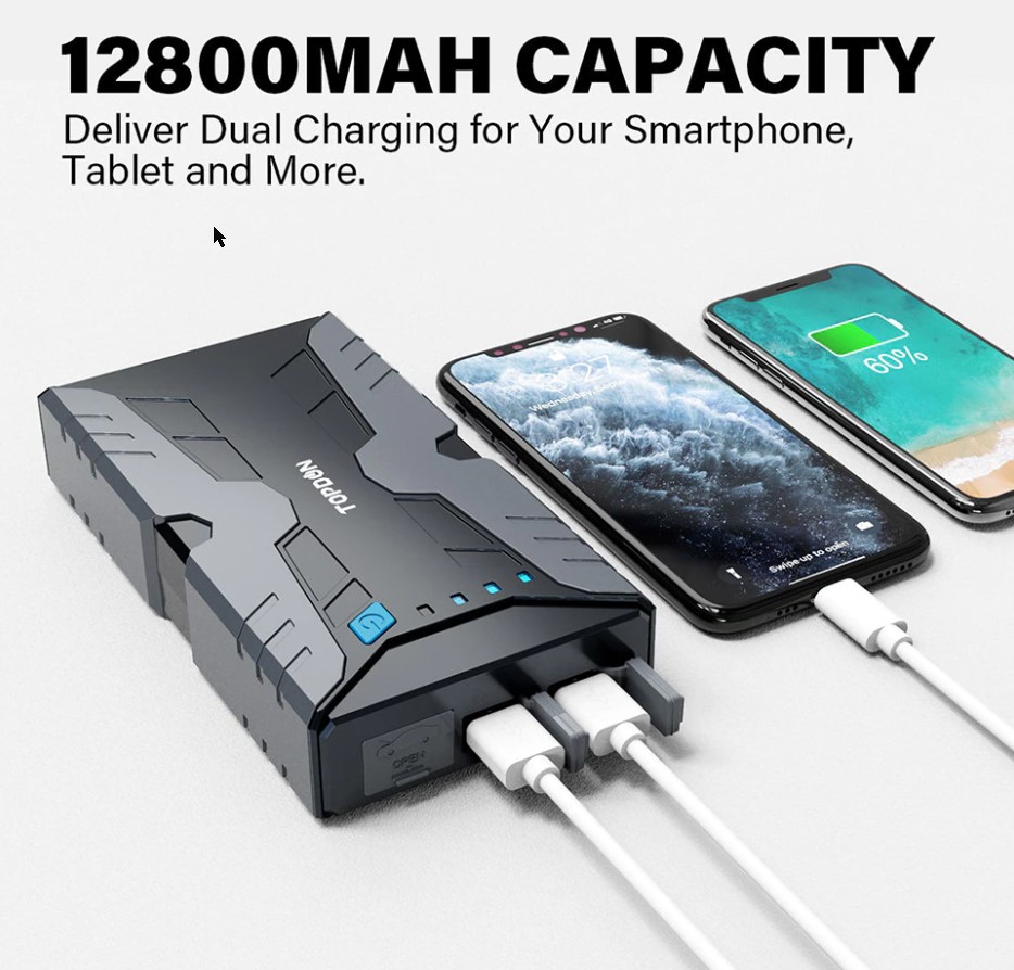 9.12800mAh powerbank, dobbelt USB -opladning og strøm til andet biltilbehør via 12V 10A DC -port.