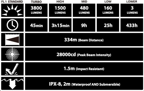 Lygten har 5 forskellige lysstyrker, samt strobe, beacon og SOS mode. Lysstyrke og funktion vælges ved hjælp af en ekstra kontakt på siden. Lygten slukkes på kontakten i bunden.